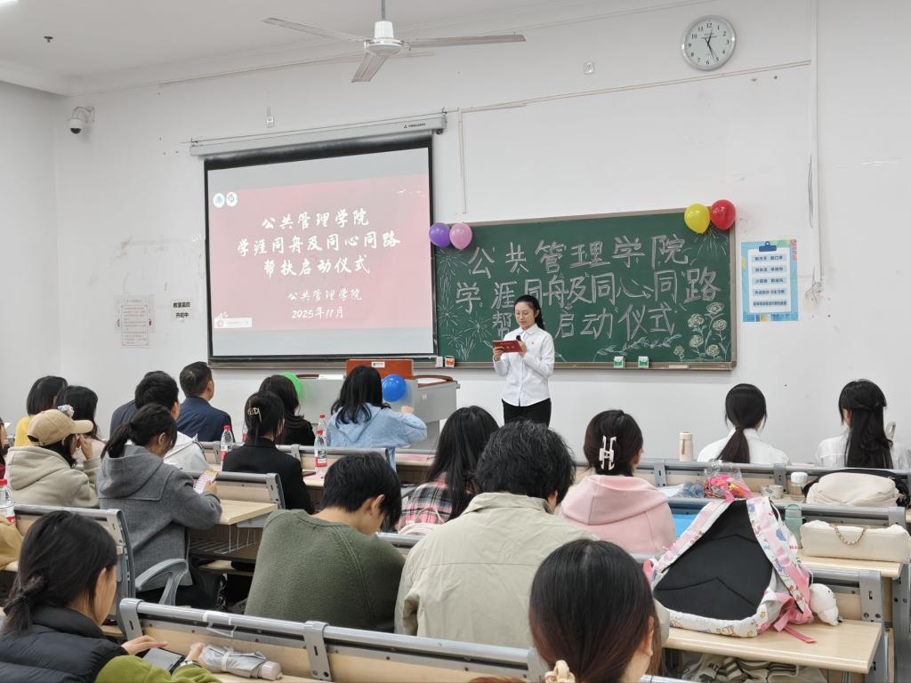 为深入推进学风建设,充分发挥学生组织与骨干的引领作用,2025年11月,公共管理学院在教学楼举行第二届学涯同舟及同心同路帮扶活动启动仪式。校党委委员、副校长李春雷亲临启动仪式现场指导,还参与后续校领导午餐会,与师生代表深入交流,为学风建设出谋划策。公共管理学院院长李辉、党总支书记罗婷婷,全体学工队伍教师、学生组织工作人员及学生代表共同参与。