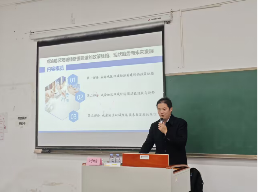 为帮助土地资源管理专业新生深入理解国家重大区域发展战略,明确专业学习方向,2025年12月1日,我校公共管理学院为2025级土地资源管理专业新生举办了题为《成渝地区双城经济圈建设的政策脉络、现状趋势与未来发展》的专业讲座。本次讲座特邀重庆工商大学长江上游经济研究中心副主任、硕士研究生导师刘晗教授主讲,旨在引导同学们从专业视角认识区域发展战略,培养新时代国土空间治理的使命感和责任感。