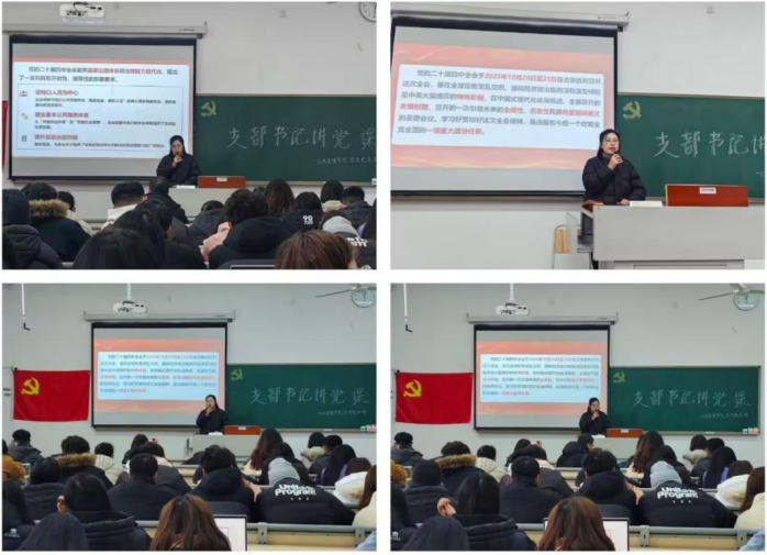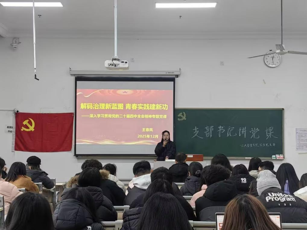 为深入学习贯彻党的二十届四中全会精神,2025年12月23日,公共管理学院学生党支部书记王春凤在1405教室以“解码治理蓝图青春实践建新功”为主题,讲授专题党课。本次党课紧密围绕党的二十届四中全会核心要义,引领全体同志深刻领会会议精神,进一步深化学院学生党建工作、助力学子成长成才,同时引导大家立足专业精准定位,传递了对公共管理学院全体同志勇担中国式现代化建设青春使命的殷切期待。