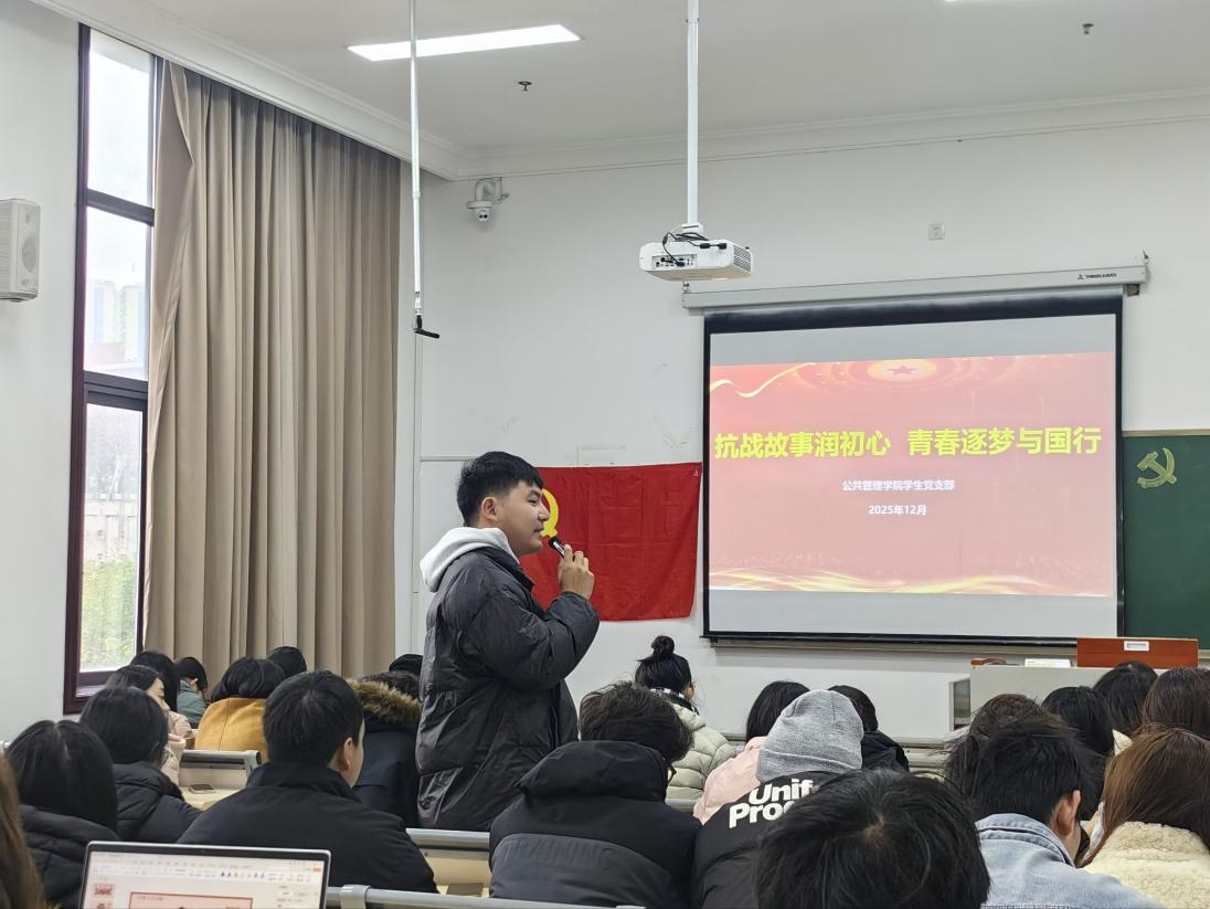 为深化青年学子的家国情怀,从抗战故事中汲取成长力量,公共管理学院学生党支部于2025年12月23日在1405教室,开展“抗战故事润初心·青春逐梦与国行”故事分享活动,围绕“故事中的精神对成长的启示”展开讨论。