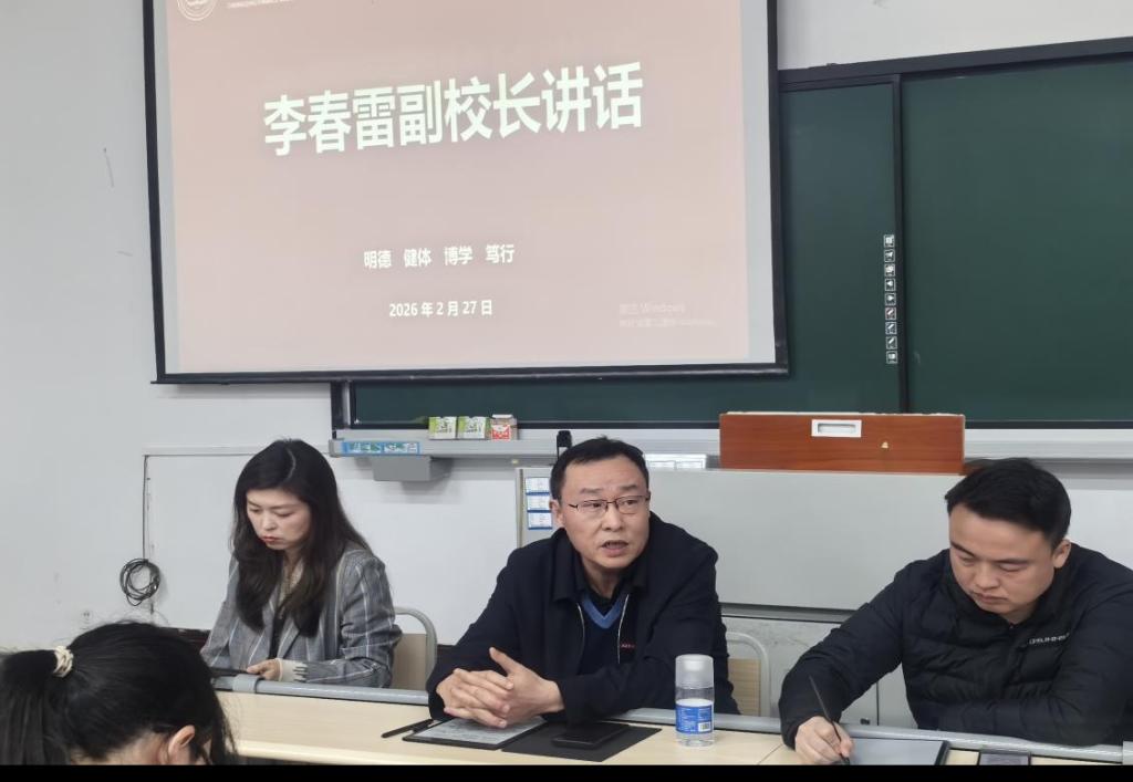 为深入贯彻学校2025-2026学年第二学期第一次全体中层干部大会精神,全面落实本科教学工作合格评估决战决胜要求,统筹部署新学期各项工作,引导全体教职工收心归位、聚力攻坚,2月27日上午10:30在教学楼1301教室,公共管理学院召开了2025-2026学年第二学期第一次全体教职工会议。学校副校长李春雷莅临指导,学院院长李辉、党总支书记罗婷婷出席会议,全体教职工参加会议。会议由副院长余天霞主持。