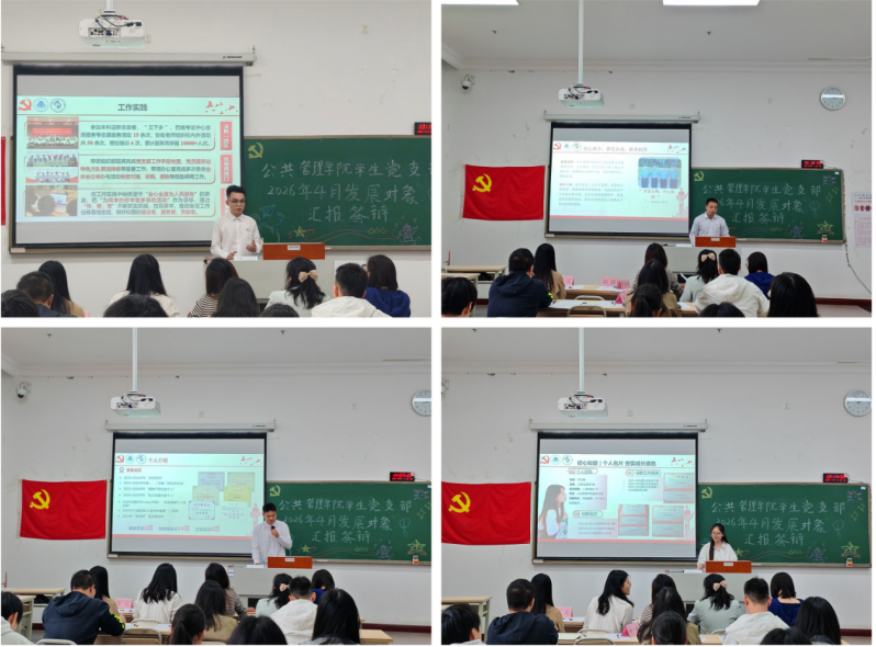 答辩会上,各位入党积极分子依次上台汇报,通过PPT展示的形式,从个人基本情况、入党初心、思想淬炼、理论学习、先锋模范作用发挥及实干担当等方面进行全面阐述,详细汇报了自身作为入党积极分子期间的成长与进步。他们结合自身学业学习、学生工作、志愿服务等亲身经历,生动讲述了自己在思想上主动向党组织靠拢、行动上以党员标准严格要求自己的历程:有的分享了参与本科迎新、“三下乡”社会实践等志愿服务15余次,服务同学及群众超1000人次的实践故事,用奉献诠释责任;有的讲述了退伍复学后坚守报国初心、永葆军人本色,在党员服务站工作中锤炼党性、践行使命的经历;还有的展示了在党支部材料审核、主题党日活动策划等工作中的实干成果,以务实作风彰显青年担当,深刻诠释了新时代青年对党的忠诚与坚定信仰。