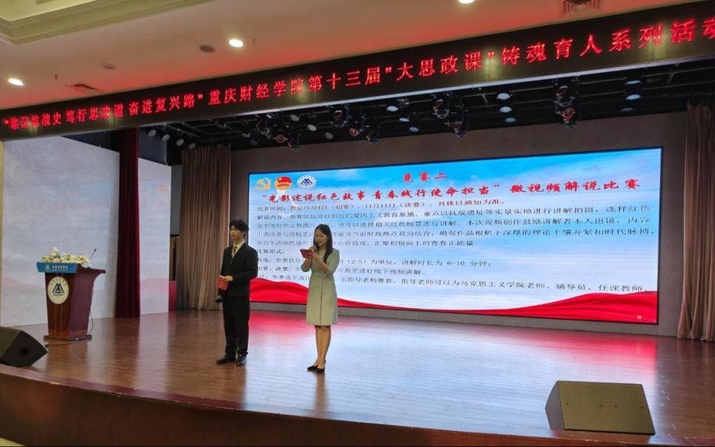 为将抗战历史教育与思政育人深度融合,引导师生从红色历史中汲取力量,进一步凝聚强国建设、民族复兴青春动能,10月29日中午,由重庆财经学院马克思主义学院、重庆财经学院党委宣传部、共青团重庆财经学院委员会、重庆市巴南区教师进修学院、重庆财经学院公共管理学院、重庆财经学院新媒体艺术学院主办,公共管理学院团总支、学生会,新媒体艺术学院团总支、学生会承办的第十三届“大思政课”铸魂育人活动,在学术报告厅正式启动。
