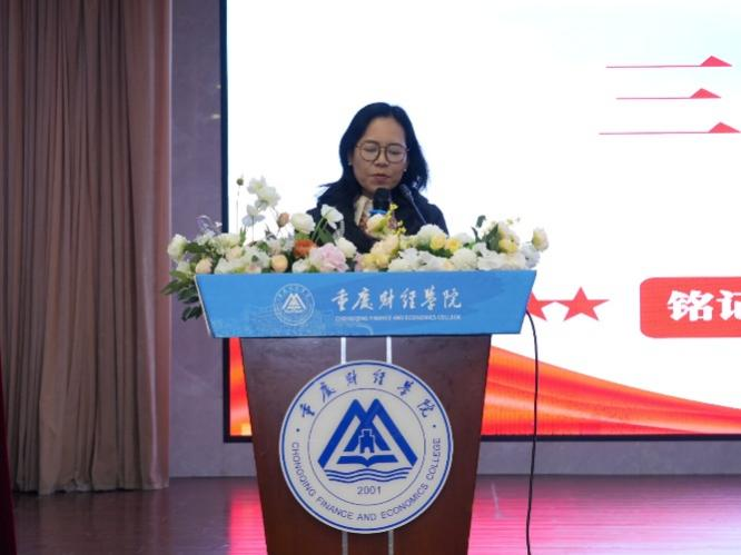 接着,马克思主义学院院长常晓薇作了重要致辞。她指出,在中国人民抗日战争暨世界反法西斯战争胜利80周年的重要节点,习近平总书记“铭记历史、缅怀先烈、珍爱和平、开创未来”的重要论述,为传承红色基因、深化思政育人指明了方向。在此背景下,举办第十三届“大思政课”活动,有助于将抗战历史教育与思政育人深度融合。常院长还回顾了马克思主义学院多年深耕思政教育的丰硕成果,如思想政治理论实践课获批重庆市一流本科课程,三个课堂联动育人案例入选市级一流本科课程案例,学生作品斩获教育部“我心中的思政课”全国大学生微电影比赛优秀奖等荣誉。这些积淀让思政教育走出课堂、浸润心灵,将红色基因植入青年血脉,为学校获评大中小学思政课一体化建设组长单位筑牢根基。常院长强调,思政教育是国之大计、党之大计,我们应当以“大思政课”活动为纽带,高举伟大抗战精神的火炬,传承红色基因,厚植家国情怀,让青春在为强国建设、民族复兴的不懈奋斗中绽放绚丽之花!