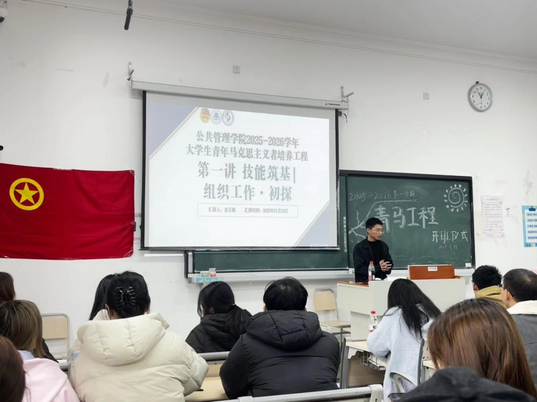 2025年11月18日,重庆财经学院公共管理学院2025-2026学年大学生青年马克思主义者培养工程第一讲如期举行。本次讲座以“技能筑基|组织工作·初探”为主题,由余天皓担任主讲人,学院青马工程全体学员、部分学生组织骨干共同参与,为青年学子搭建了组织工作能力提升的学习平台。