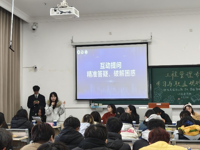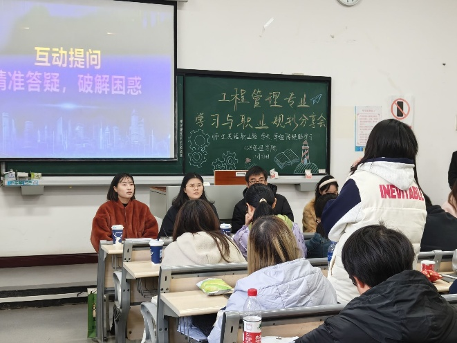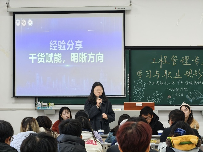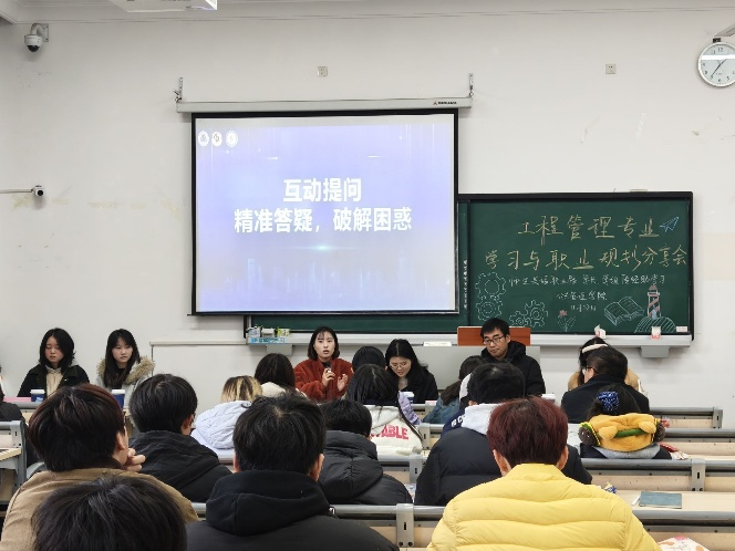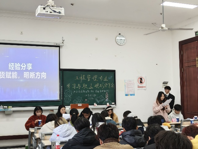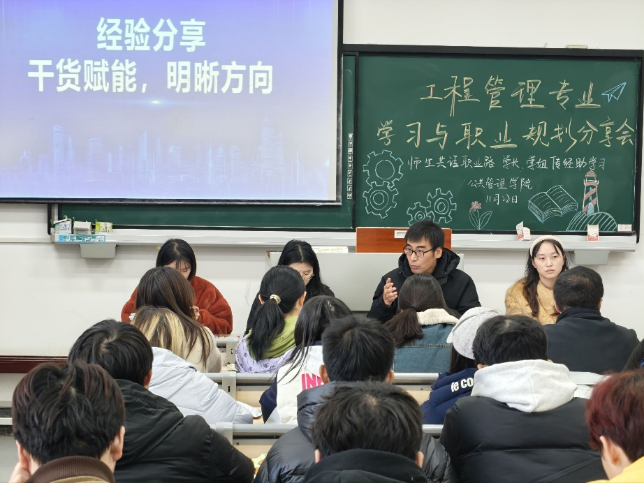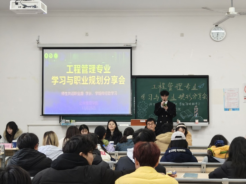 11月28日中午,公共管理总协会工程分会于教学楼1305教室成功举办工程管理专业学习与职业规划分享会。公共管理学院团总支书记阳圆、工程管理专业康建功老师、专职组织员王芹及专职辅导员梁艳、蒋宇峰、李政老师莅临和工程管理专业40多名同学参与,共同探讨职业发展路径,学长学姐倾囊相授学习经验。