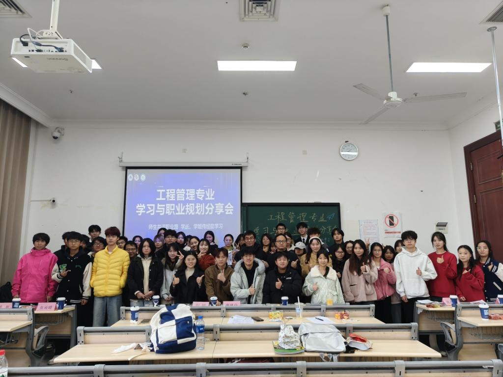 活动尾声,全体师生合影留念。此次分享会搭建了师生互动、学长学姐传帮带的良好平台,不仅为25级同学提供了实用的学习方法、升学技巧与就业指导,更帮助大家清晰了未来职业发展路径,进一步增强了逐梦前行的信心与决心。活动赢得了师生们的一致好评,大家纷纷表示将把所学所悟转化为实际行动,在专业学习中锤炼本领,在规划引领下稳步成长,为工程管理专业的人才培养与职业发展注入新的活力。