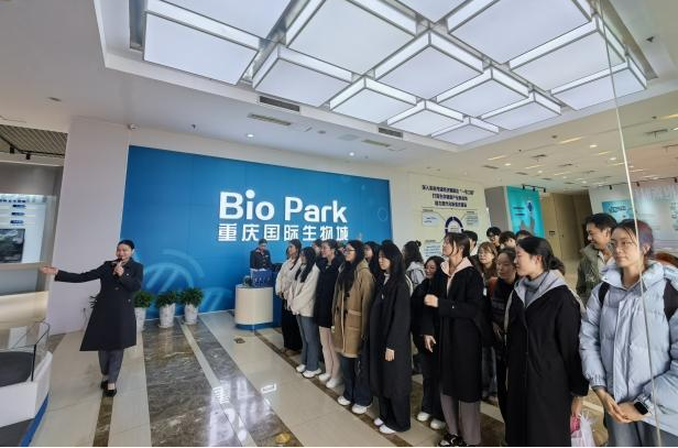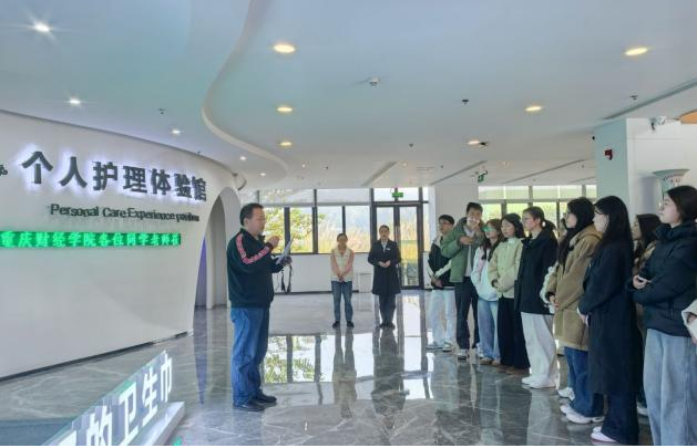 活动首站,队伍抵达重庆国际生物城展厅。专业讲解员为学生详细介绍了生物城的发展历程、产业布局及创新成果,并帮助学生构建对健康产业生态的整体认知。随后,队伍来到重庆国际免疫研究院。讲解员围绕免疫学前沿研究、技术转化与临床应用展开解说,学生通过实地观摩展厅内的实验室设备与研究项目,深入理解了健康管理中的疾病预防与精准干预理念。最后,队伍前往重庆百亚股份有限公司进行参观。企业代表分享了健康产品研发、生产流程及市场运营模式,并结合大健康产业链案例,阐述了企业如何通过创新管理提升服务效能。